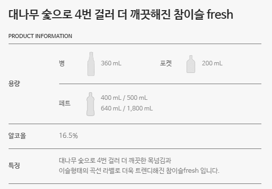 젊은층에게 인기 있는 후레쉬는 16.5도로 대나무 숯으로 5번 걸렀다고 한다. 마케팅이겠지만 그만큼 가볍고 깔끔한 맛을 자랑한다고 하는데, 후레쉬 용량은 360ml로 포켓과 페트도 다양한 용량으로 구분되어 있다.